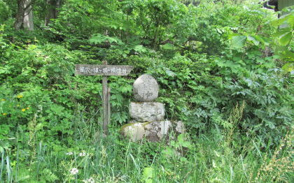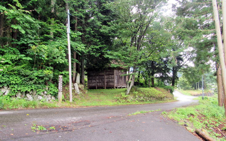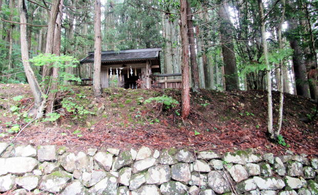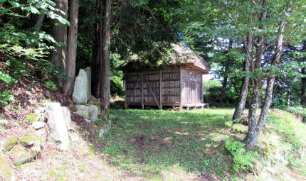 伊勢社がある段丘下の東側には、石垣の土台の上に小さな祠が置かれています。古びて傾きかけています。何の説明や標札もないのですが、火伏の神、熊野権現社ではないかと思いました。