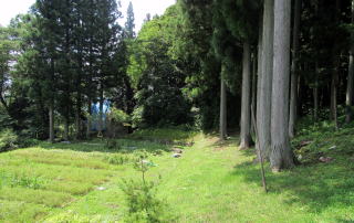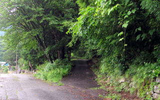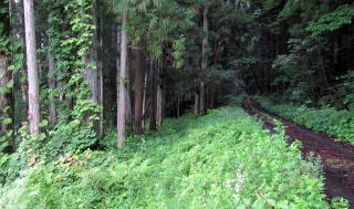 伊勢社への石段参道がある林道は、サイン林の奥にのぼっていく小径です。これが往時の千国街道跡ではないかと見られます。しばらく進むと、杉樹林の草地に分け入っていくような狭い道の跡と思しい地形があります。