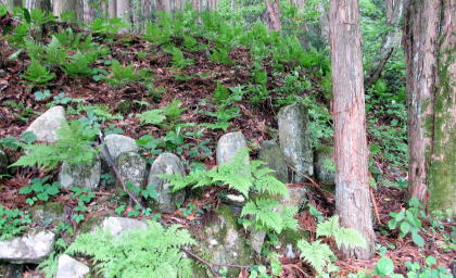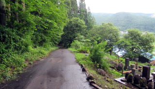 ▲細い林道は墓地の脇を抜けて山林ににぼってくる