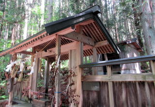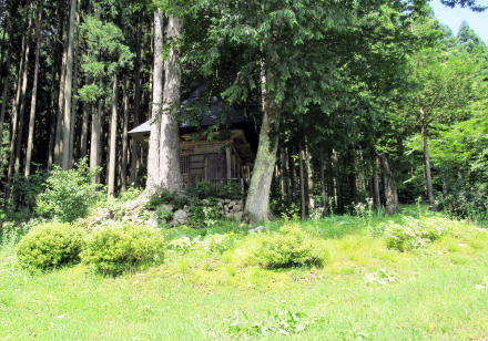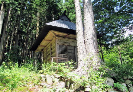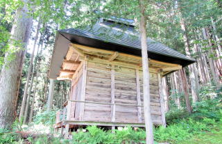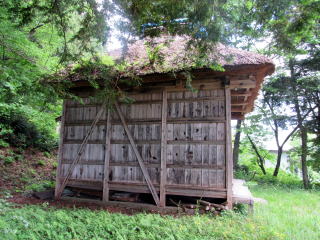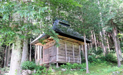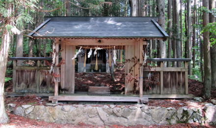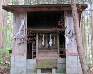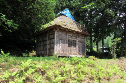 薬医門だけの簡素な拝殿ですが、全体の形は神明風(南向き)の造りになっています。門の奥には、これまた簡略な造りの蓋舎に覆われた本殿が置かれています。古い時代には神明造りで拝殿と本殿が連結した社殿があったのでしょうが、過疎化が進んだため、昭和期末から平成期はじめ頃に簡易な拝殿と本殿蓋舎を今の形に改築したのではないでしょうか。