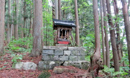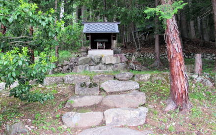 これらの社殿群の南側、街道近くの斜面にも小さな祠があります。こちらは近年、補修されたようです。しかし、これまた標札はありません。祠の脇には小さな沢が流れ下っています。木崎湖畔にあって、水の流れの近くということで、これは水神社ではなかろうかと推測しました。