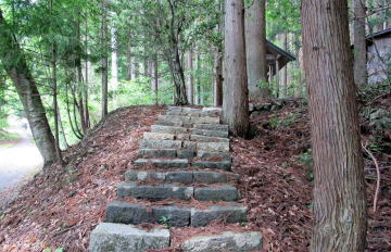 不動尊の境内の南側に山腹にのぼっていく林道があって、これが古くは千国街道だったのではないかと思われます。この小径に入るとすぐに伊勢社への石段参道があって、石段をのぼった壇上に拝殿を兼ねた薬医門と蓋舎に覆われた本殿があります。