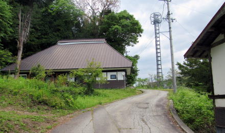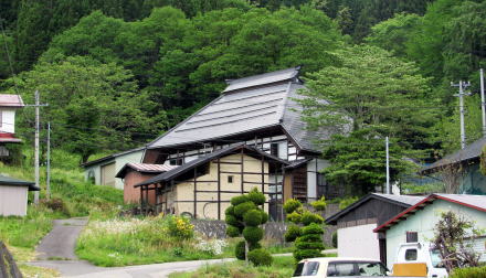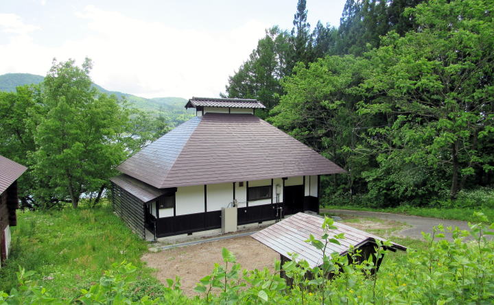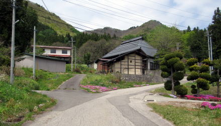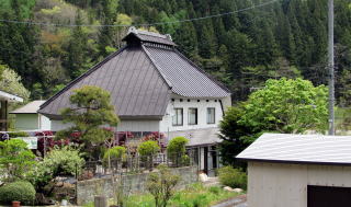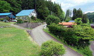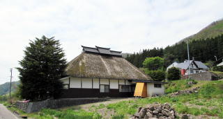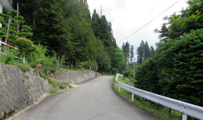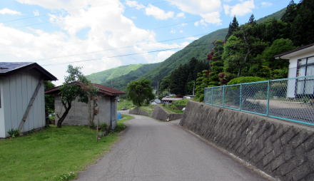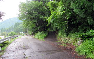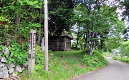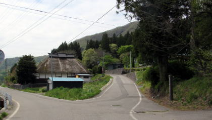 さて、湖畔とあまり変わらない高さまで下ってきた道路は三叉路分岐点に出会います。そこには、この集落でたった1軒の茅葺屋根のままの古民家があります。その古民家の東側の道は、そのまま湖畔に向かって低い位置を往きます。もうひとつの山腹に向かってのぼっていく道が千国街道だということです。