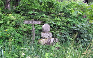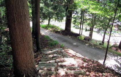 現在の千国街道から分かれて、その石垣の脇を山腹に沿って行く林道がおそらく往時の街道の跡だと思われます。林道の谷側に分岐して、等高線と平行に樹林のなかを往ったであろう獣道のような痕跡がありますが、これが往時の塩の道だったのではないかと推測されます。