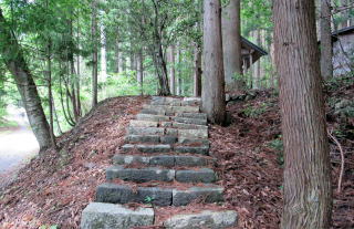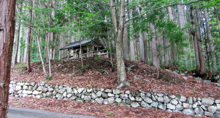 お堂の南西側、森のなかには伊勢社があります。伊勢社は、山腹の丘陵斜面に位置する小さな台地(壇)の上にあって、台地の道路側の法面は石垣で支えられています。