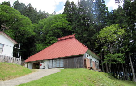 私は山裾をのぼっていく小径を選びました。小径の西側は急傾斜の山腹斜面で、深い山林となっています。分岐から170メートルほど進むと、小径の西傍らに茅葺の小さなお堂があります。屋根が朽ちかけた古いお堂です。