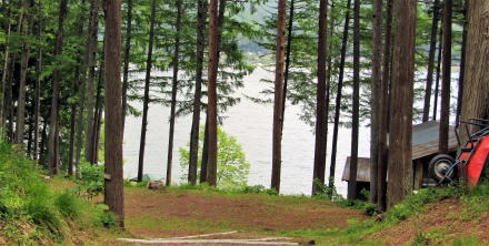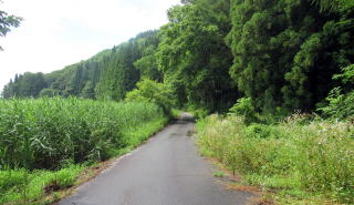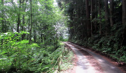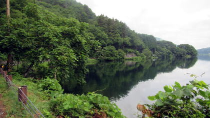◆キャンプ場付近◆ 今歩いている湖畔の道は、じつは往時の千国街道ではありません。その証拠は、この道筋には塩の道に特有の石仏がひとつも見あたらないことです。今は山林に埋もれてしまっていますが、ここよりも20~30メートルほど高いところに古い塩の道跡があるはずです。そこには、おそらく1丁ごとに石仏が置かれていたはずです。