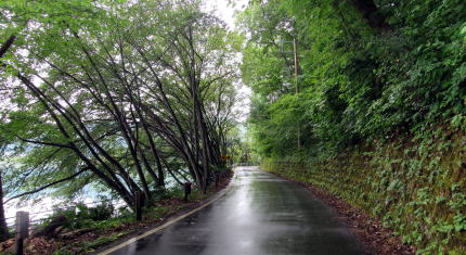 湖畔に近くなったとはいえ、道は湖畔の近いや張り出した尾根や入り江の形に添って折れ曲がり上下に起伏します。高いところは、湖面から10メートル以上も高いところを往き、低い場所は湖面からわずか1メートルあるかないかの低地をはしっています。