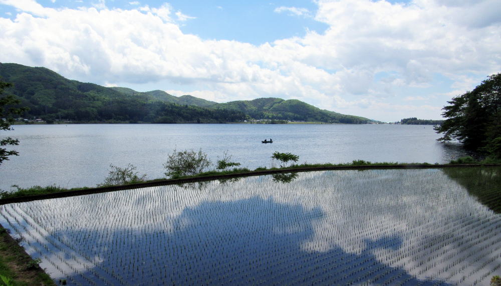 ▲木崎湖畔を往く千国街道から湖畔の水田を見おろす: 湖畔湿原を水田に変えたので、湖面と水田が一続きに隣り合っている