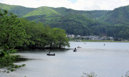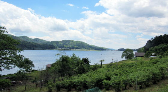 ▲街道東傍らの湖畔斜面にはブルーベリー園がある