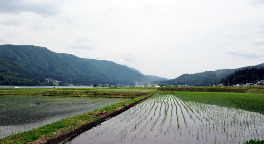 そこには住居が集まっていて、家並みのあいだにブルーベリーや野菜を栽培する畑作地が割り込んでいます。湖畔低地には大量の伏流水が湧き出て、稲作に必要な農業用水の水源をつくっているのです。
