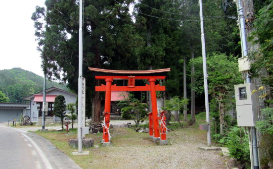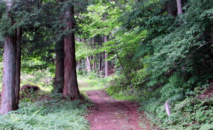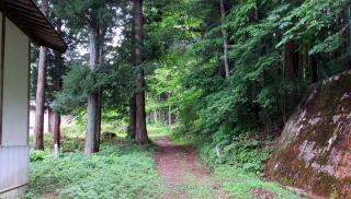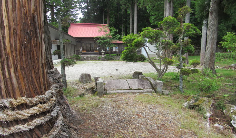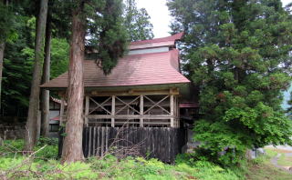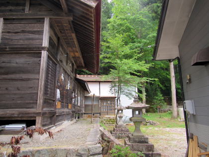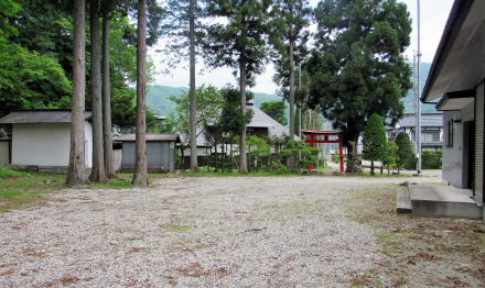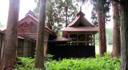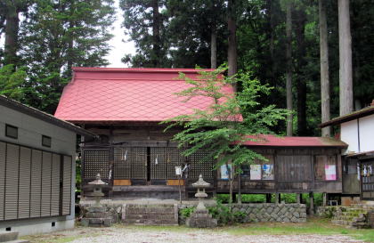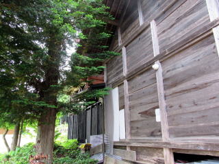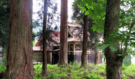 ![]() ▲簡潔な切妻造りの拝殿: 茅葺造りを昭和期に改修または改築したようだ ![]() ▲拝殿前から境内を見わたす ![]() ▲改題の北脇を県道が通っている ![]() ▲境内南端は山麓で道となっている ![]() ▲拝殿は、本殿を覆う蓋殿と連結している: 本殿はみごとな造り ![]() ▲本殿の蓋殿の背後からの眺め: 杉樹林が本殿を守っている形だ ![]() ▲拝殿の横(北側)からの眺め |