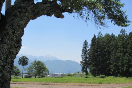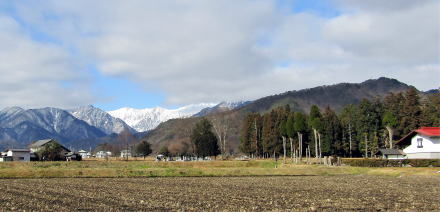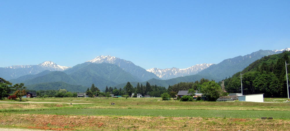 ▲仁科郷~借馬の西には北アルプスが迫る。中央が蓮華岳、その左側が針ノ木岳、右奥には鳴沢岳。手前右端が小熊山系の尾根、その奥が白沢天狗山。右端に爺ケ岳山頂。