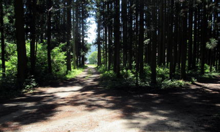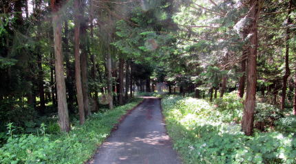 ▲大町市平にある稲荷神社を取り囲む森: サワラや杉などからなる森に向かって往く小径が塩の道の遺構らしい