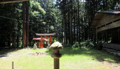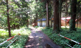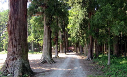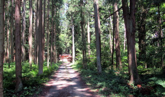 ▲杉とサワラの杜に囲まれた稲荷神社への参道が塩の道の遺構だという