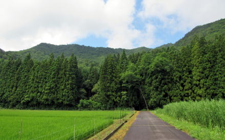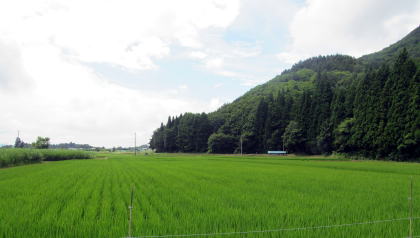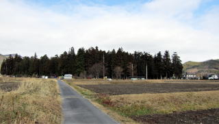 木崎湖南端の入り江と小熊山系の尾根とのあいだには、湖畔沿いに森城址がある丘陵が南北に延びていて、その西側には水田地帯が広がっています。この辺りは往時、湖岸の窪地で湿原でした。 ◆森のなかの稲荷神社◆ この森は、サワラと杉を植林して育てた――程よく手入れされた――人工林です。広大な水田地帯のなかに孤島のように取り残された森で、変形ハート形で、差し渡し220~250メートルほどです。周囲よりもわずかに高い丘をなしています。ほとんどが民有林です。明治維新で神社の所領が没収されたときに、土地を買い取った所有者が鎮守の杜として守ってきたのかもしれません。