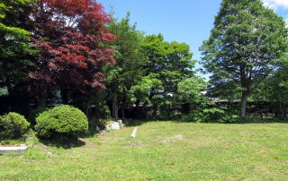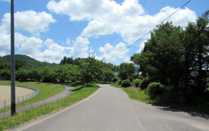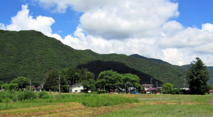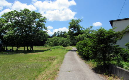 昭和初期までは森集落の西側は、ほとんどが木崎湖南西畔の湿原だったようです。そのため、それまでの塩の道(千国街道)は、湖の西側の小熊山系南端の尾根の背または中腹を通っていたそうです。そこから湿原地帯を避けて街道が降りてくるとすれば、尾根の支脈が東に張り出してこんもりとした小山となっているところの南東斜面辺りかと見当をつけました。街道が平坦地に出てくるのは、現在の平運動場の辺りだったのではないでしょうか。
