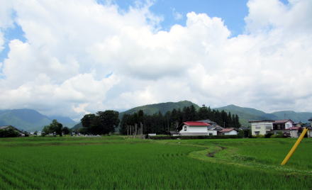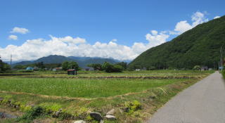 木崎湖の南には広大な扇状地が広がっています。複合扇状地ですが、農具川沿いの扇状地は、鹿島川や高瀬川がつくり出した扇状地よりも幅が広く、地形も平坦です。