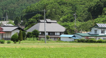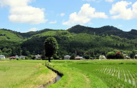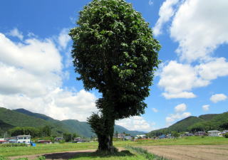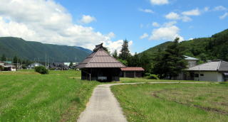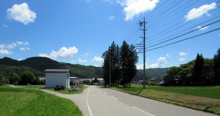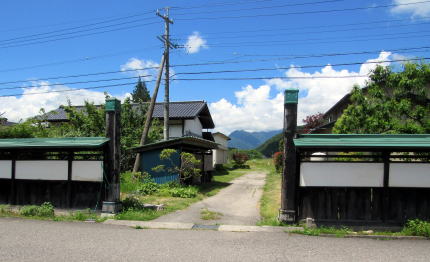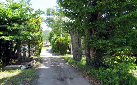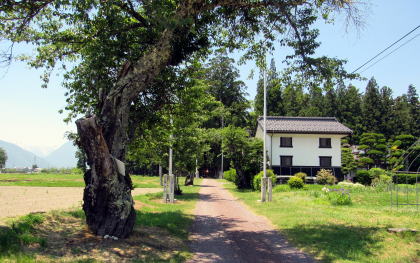 鳥居の扁額には「正弐位稲荷大神」と書かれています。古くからある稲荷社らしいのですが、由緒や来歴に関する史料は見つかりません。この樹林の所有者が樹林から200メートルほど東にある集落の住民だということなので、その住民たちがが氏子として稲荷社を守っているのでしょう。 ◆近隣集落を訪ねる◆ 稲荷社の氏子となっている集落は、国道148号の西側を往く道路――千国街道の脇往還らしい――に沿って南北に細長く家並みが続いています。その集落に向かう農道の脇にトチノキが立っています。森の端から70メートルほど北に当たる場所です。