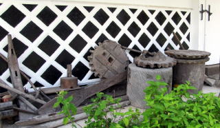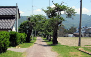![]() ▲右端の樹林が金山神社の鎮守杜。背後に蓮華岳や鳴沢岳などが見える ![]() ▲金谷神社脇から流れ下る用水沿いのヒバ並木 人びとは水の猛威を怖れて平坦部には定住せずに、その周囲の山間部や山裾に集落や耕作地を開いていたようです。 |