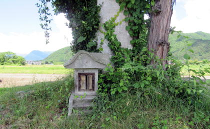 明治以降昭和にかけて、木崎湖南部の地理はすっかり変わってしまったようです。水田地帯に孤立して立っているトチノキとその根方の石祠は、神社か仏堂がそこにあった痕跡かもしれません。