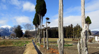 金山神社は、鍬や鎌などの農具、手斧や鋸をつくる鍛冶職人たちが篤く信奉した社だそうです。 ![]() ▲塩の道の痕跡は県道325号に出会ったところで消えてしまう ![]() ▲金山神社の鎮守の杜 ![]() ▲金山神社への参道の入り口 ![]() ▲かつてあった桜並木の名残をとどめる古木 ![]() ▲桜の古木の傍らから西方の眺め: 北アルプスの前哨山塊が見える ![]() ▲樹齢300年近い杉大木の並木が深い木陰をつくる ![]() ▲金山神社の大鳥居: 背後に見えるのは拝殿 ![]() ▲静謐な境内のなかに佇む拝殿 ![]() ▲境内社の祠群の背後に本殿が見える ![]() ▲拝殿の背後に控える本殿の造りが美しい ![]() ▲拝殿の西脇に控える社務所: 美しい結構だ 北安曇地方は、古墳時代から、そして日本海側からも太平洋側からも安曇族などの諸族の南北往来があったところです。渡来人や初期密教修験者が鉱山の探索や採掘、精錬、さらに製銅や製鉄、冶金などの技術を携えて農耕地や集落の開拓に参加し支援したとも言われています。彼らが尊崇し祀った神が金山彦です。 |