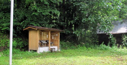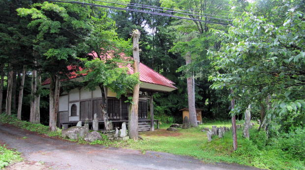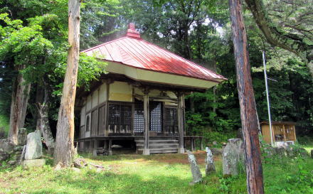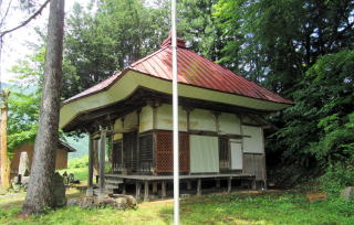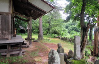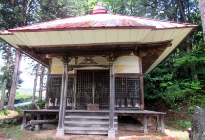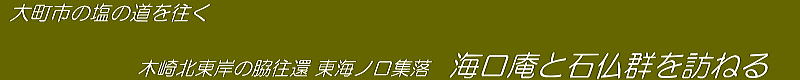 木崎湖北東岸の東海ノ口集落にも固有の祈りの場がいくつかあります。有名なのは海口庵という小さなお堂です。湖畔から北東岸の尾根高台にのぼる小径の脇にある石仏に囲まれた禅庵です。 この庵の本尊は観音菩薩で、いかにも千国街道沿いの村に似つかわしいものです。境内は、権現山から南西に張り出した尾根の突端にあって、南に木崎湖の湖面を見おろす丘陵に位置しています。