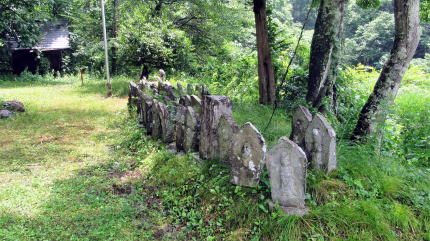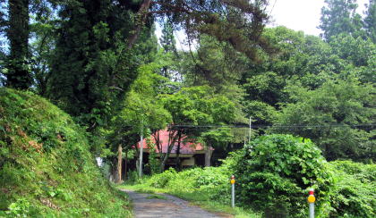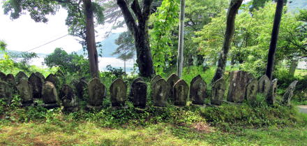 ▲湖の北東岸にせり出した尾根丘陵を下る小径: 石仏や石塔群に囲まれ、道の東脇に海口庵、西脇に公民館がある