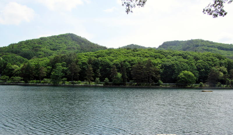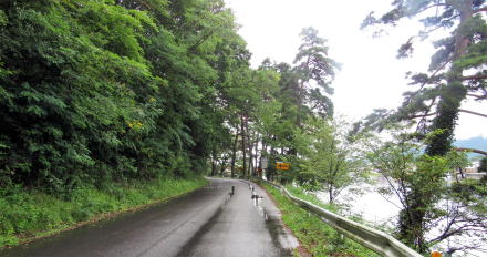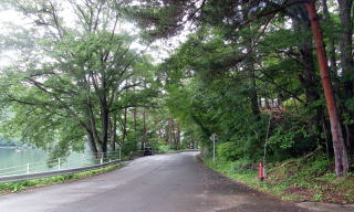湖畔の道は、居谷里山の頂から西に張り出した尾根に押されているように湾曲しています。右手に湖面を眺め、湖を吹きわたる風を浴びながら、尾根の森と松並木の日陰を往く、夏でも涼しい道路です。車道と湖との間には、湖畔の散策路があって、そこで散歩や釣り楽しむ人が目立ちます。