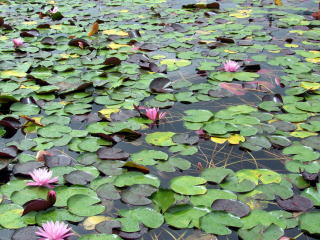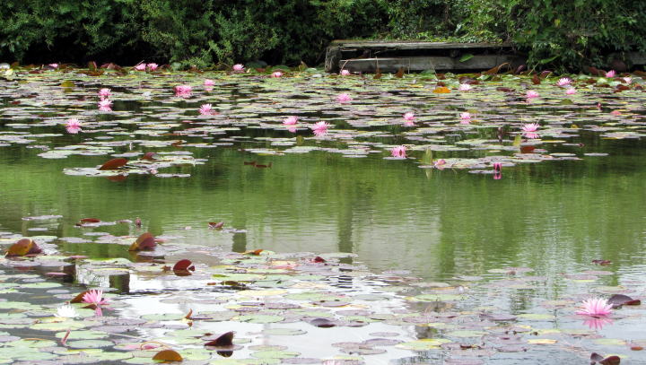 私は、往還を西に折れて湖の南岸の草地に向かいました。そこで、岸辺近くに群生する睡蓮を見るためです。7月の終わりごろから8月いっぱい、睡蓮は水面に美しい花を咲かせます。水面に浮かぶ無数の睡蓮の葉と水の穏やかな揺らぎが織りなす景観は、あたかもクロード・モネの絵のようです。