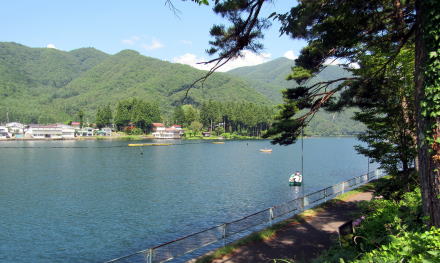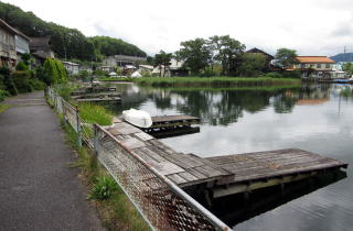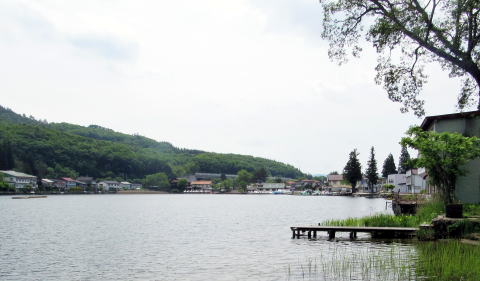 ところで、旅館街の裏手(西側)には、狭い散策路を挟んで湖面が迫っています。各旅館は小さな桟橋の船着き場を備えていて、泊り客は小舟で水遊びやワカサギ釣りのために湖に出ていくことができます。もちろん部屋のなかの窓辺で、美しい湖の風景を楽しみながら、涼風を浴びてくつろぐこともできます。