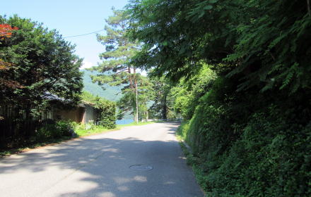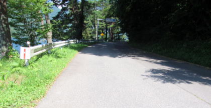 JRの線路下から始まる湖畔の木陰の道は、800メートルほどの間はせり出している尾根斜面が湖岸となっているため、路傍が湖面に接しています。その先に進むと、尾根下に少しずつ平地が広がっていく地形となります。