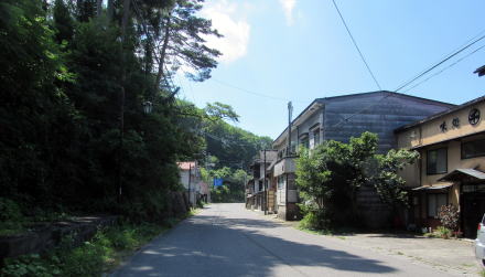 さて、八幡神社の下を往く道の西脇には観光客向けの旅館街が200メートルほど続いています。旅館の裏手が湖面です。旅館は昭和前期に建てられた和風の造りのものが多く、脇街道の趣きが漂っています。とはいえ、高齢化でかなり以前に廃業して廃墟然とした建物もあります。