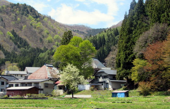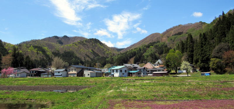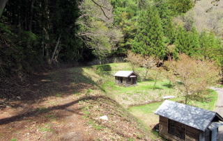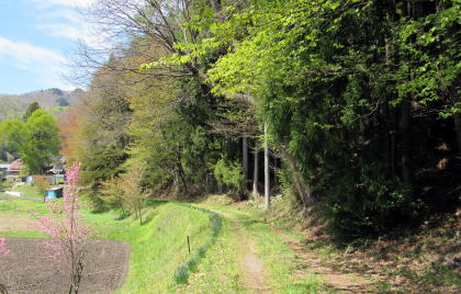 そういう勾配の比較的に緩い斜面には棚田や段々畑の跡が見られます。往古の人びとはこんなところも開拓して、水田や畑作地を開いたのです。しかし今は、耕作は放棄されて稲や野菜の代わりに山桜が植えられています。