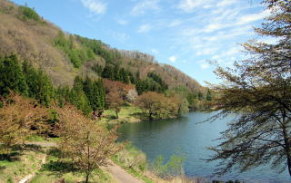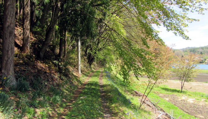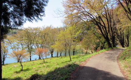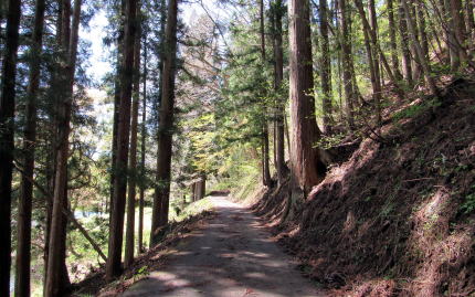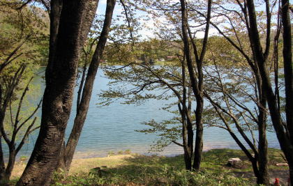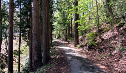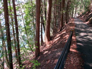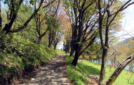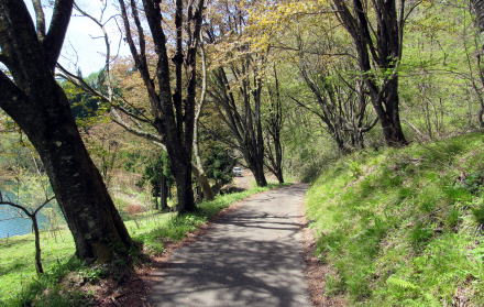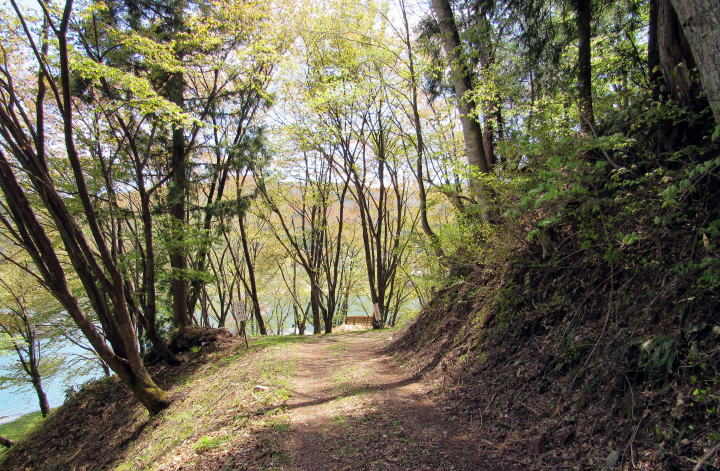 中綱湖の西岸を往く小径を取り囲む森の植生は場所ごとに大きく変化します。植林された杉樹林もあれば、落葉広葉樹林もあり、場所によっては小径の両側が山桜の並木になっているところもあります。湖岸の山腹を緩やかに曲がりながら起伏する道沿いに並ぶ山桜が開花する頃には、さぞ美しい風景が楽しめるだろうと思います。