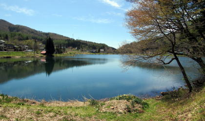 中綱湖の南西端は、湖岸での差し渡し500メートル、奥行き400メートルほどの扇状地になっています。湖の南端に注ぎ込む中綱沢とその支流群が、山腹を削り運んだ土砂を谷間に積み上げたのです。その扇状地に集落と棚田が開かれ、湖岸付近は低湿地となっています。