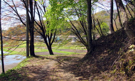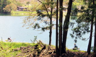 湖面との標高差を保っている塩の道とは別に、おそらくはヘラブナ釣りのために設けられたであろう畔の道もあります。私が歩いていたときにも、あちらこちらで釣りを楽しむ人たちがいました。ヴェテランらしい高齢者に訪ねたところ、これまでに体長50センチメートルにも達する大物を釣り上げた経験があるそうです。