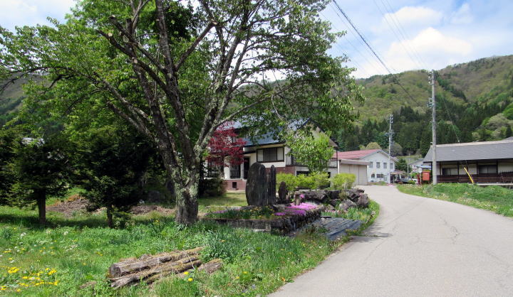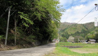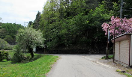 水神社を過ぎて南進する千国街道は、中綱集落南端の庚申塚・石仏群の脇を通って、鹿島槍スキー場からやって来る道路と合流し、両側から尾根が迫る狭い谷間に入っていきます。