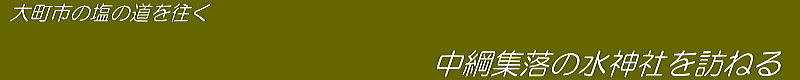 ▲中綱集落の中心部にある水神社: 赤褐色の屋根の手前が拝殿、後方が本殿、向かってその右側が神楽殿。手前の道が千国街道。