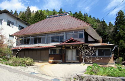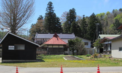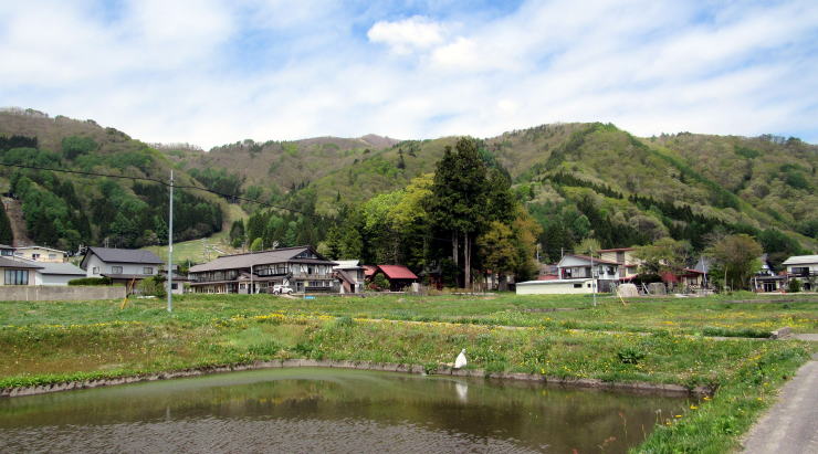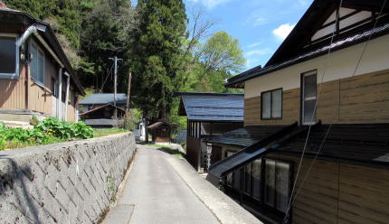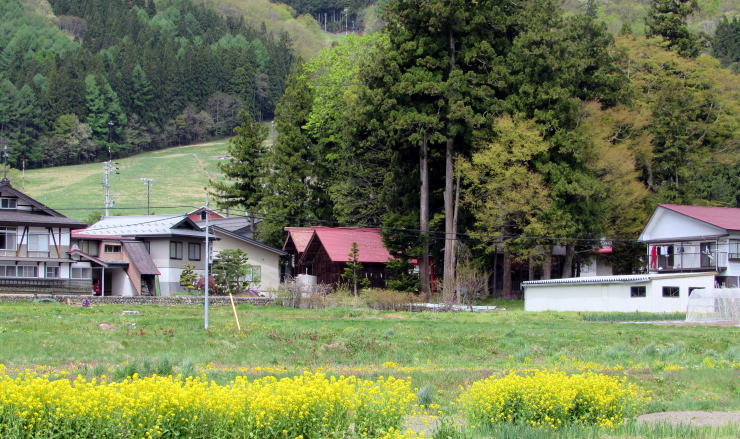 集落で一番低地にある家並みは、水田地帯の上の段丘にあります。千国街道は、もうひとつ上の段丘上を通っています。