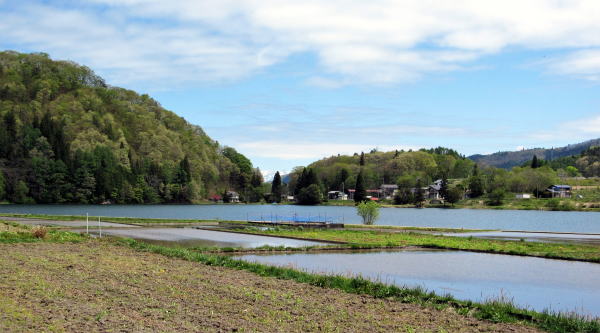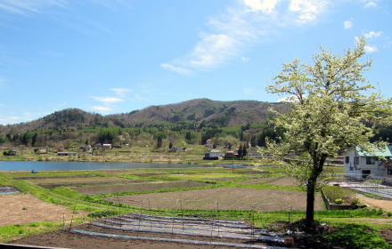 湿地帯の上の段丘には水田が広がっていて、西側の山麓に向かってきわめて緩やかな斜面となっています。