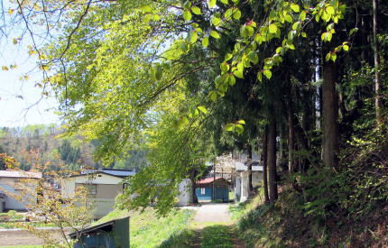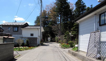 街道は、氏神社脇を過ぎると、集落の中ほどを等高線に沿って南北に貫いています。家並みは街道を挟んで西側――扇状地斜面の上方――と東側に広がっています。