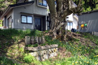さて、集落の北端にさしかかった街道の東脇には小さな祠があって、段丘崖に張り出した祠の土台はコンクリート石垣で支えられています。