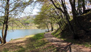 湖畔から一番下の段丘のあいだは湿地帯で、養殖池や湿田となっています。湿地帯の東端(湖の縁)には小径が通っていて、湖岸の遊歩や釣り人たちの移動に利用されています。岸辺にはところどころに釣り用の桟橋や浮橋が設けられています。