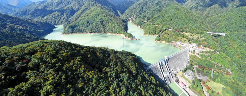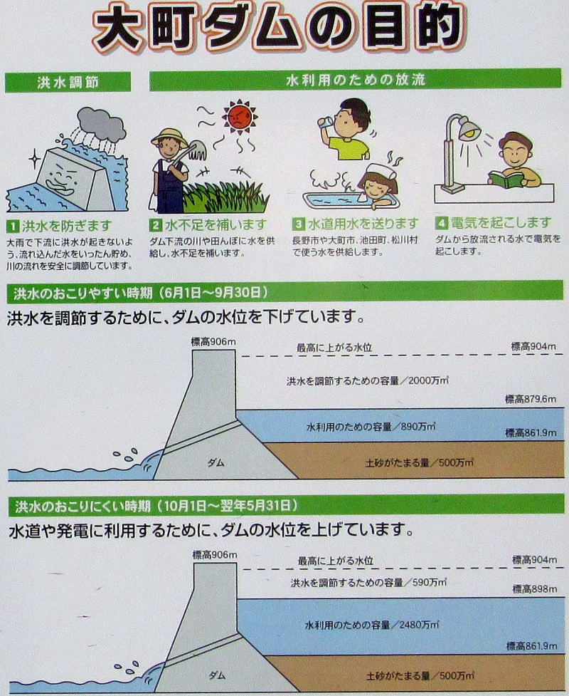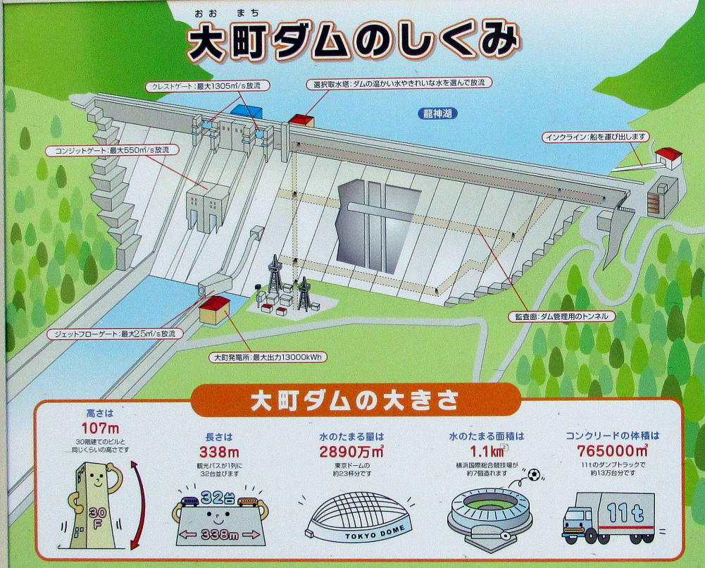 上掲の説明図や航空写真は、ダムの首位に設置された説明板からそのまま引用したものです。