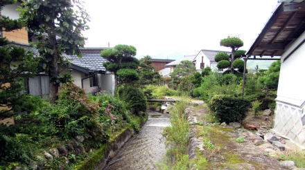 現在、大黒町の追分から三日町までは直線的な舗装道路になっていますが、往古は段丘地形や斜面の状態に応じて曲がっていたはずです。おそらく用水路に沿っていたのではないでしょうか。ただし、現在の用水路は耕地整理や土地改良で昔とは流路が違っているようですが。