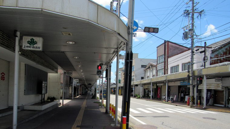 ![]() 雨雪除けの幅広の庇が商店街の大通り沿いを覆う景観は昭和中期の遺産 |