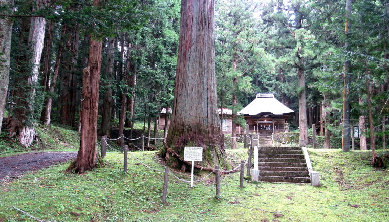 ![]() 二重の水上神社の参道と大杉(推定樹齢750年)。背後に拝殿が見える。 |