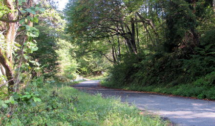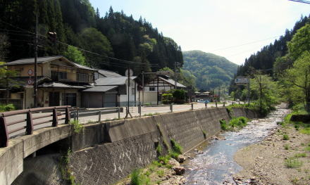 小藤を過ぎると、旧街道は尾根の北端の急斜面を土尻川の谷底に向かってジグザグに降りていきます。そして「ぽかぽかランド美麻」の西側で、土尻川河畔を往く県道31号に出会います。