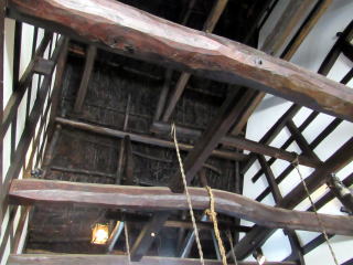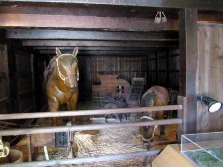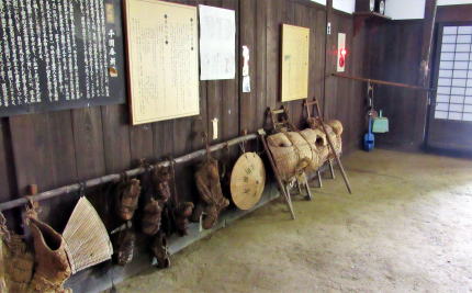 ![]() ▲番所入り口の門柱と柵、その奥が番所陣屋 資料館の資料によると、江戸初期には千国の庄屋が番所の検問役を担っていたが、やがて松本藩の行政組織が整うと、番所陣屋も設けられ、藩の役人が番所に派遣されてきたという。 ![]() ▲番所の玄関は厳めしい趣き。旅人(通行人)はこの扉から土間に入る。 ![]() ▲旅人はこの土間に座って取り調べを受けていた ![]() ▲土間の壁に架けられた背負子、藁氏、藁靴など ![]() ▲手形携行荷物改めをおこなう番所役人と書き役 ![]() ▲隣の部屋で控える役人。荷駄や手荷物を検査することもある。 ![]() ▲取り調べや検問をおこなう部屋と控部屋は隣り合っている ![]() ▲番所の敷地の端にある塩倉(ここに塩を備蓄していた) ![]() ▲酒造業者の主屋の土間に続いていた厩。番所にもあったかもしれない。 |